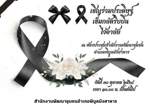 นอกจากนั้น พัฒนาการอำเภอพิบูลมังสาหาร พร้อมเจ้าหน้าที่สำนักงานพัฒนาชุมชนอำเภอ และคณะกรรมการเครือข่าย OTOP ยังได้ร่วมกันวางแผนการจัดสถานที่แสดงและจำหน่ายสินค้า OTOP และตลาดโคกหนองนา ของอำเภอพิบูลมังสาหาร ณ บริเวณหน้าสำนักงานพัฒนาชุมชนอำเภอพิบูลมังสาหาร และยังได้ร่วมประดิษฐ์เข็มกลัดริบบิ้นแสดงความอาลัย และแสดงออกถึงความเคารพและสํานึกในพระมหากรุณาธิคุณ สมเด็จพระนางเจ้าสิริกิติ์ พระบรมราชินีนาถ พระบรมราชชนนีพันปีหลวง ก่อนมอบให้กับประชาชนที่มาติดต่อราชการ และในพิธีบําเพ็ญกุศลสัตตมวาร (7 วัน) เพื่ออุทิศถวายเป็นพระราชกุศล สมเด็จพระนางเจ้าสิริกิติ์ พระบรมราชินีนาถ พระบรมราชชนนีพันปีหลวง ในวันพฤหัสบดีที่ 30 ตุลาคม 2568 ร่วมกับคณะกรรมการพัฒนาสตรีอำเภอพิบูลมังสาหาร ต่อไป
