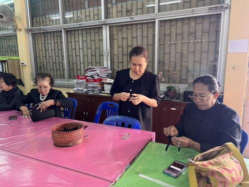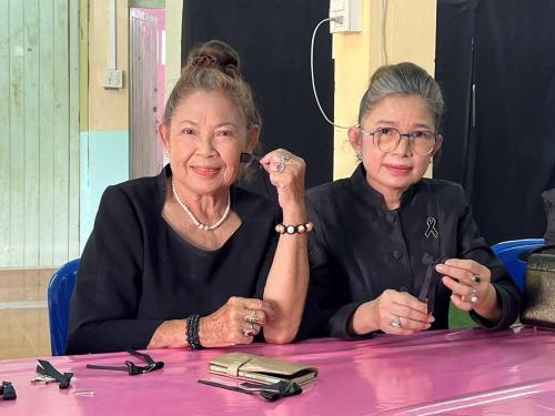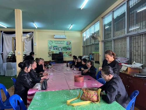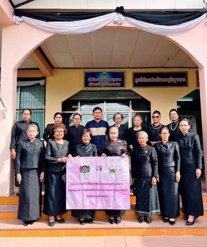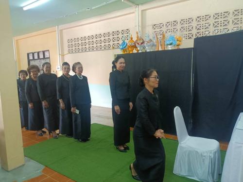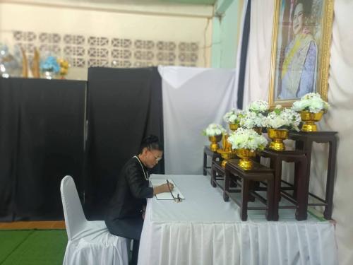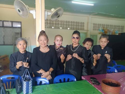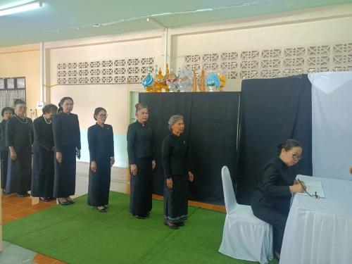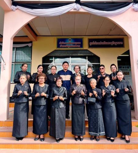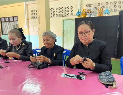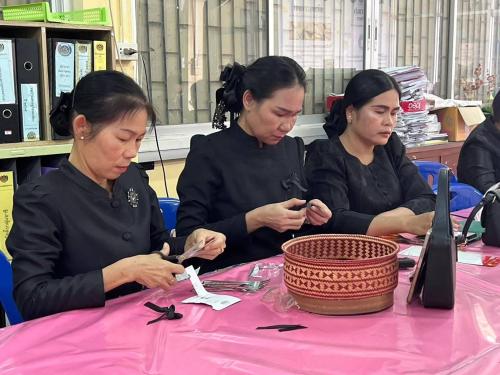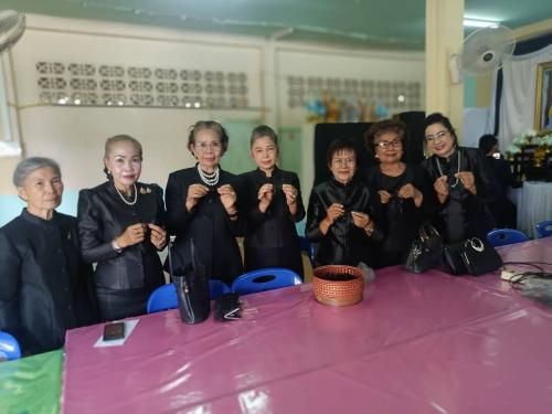 พช.-สตรี พิบูลมังสาหาร ร่วมร่วมกันประดิษฐ์เข็มกลัดริบบิ้นแสดงความอาลัย และลงนามแสดงความไว้อาลัย เบื้องหน้าพระฉายาลักษณ์ สมเด็จพระนางเจ้าสิริกิติ์ พระบรมราชินีนาถ พระบรมราชชนนีพันปีหลวง